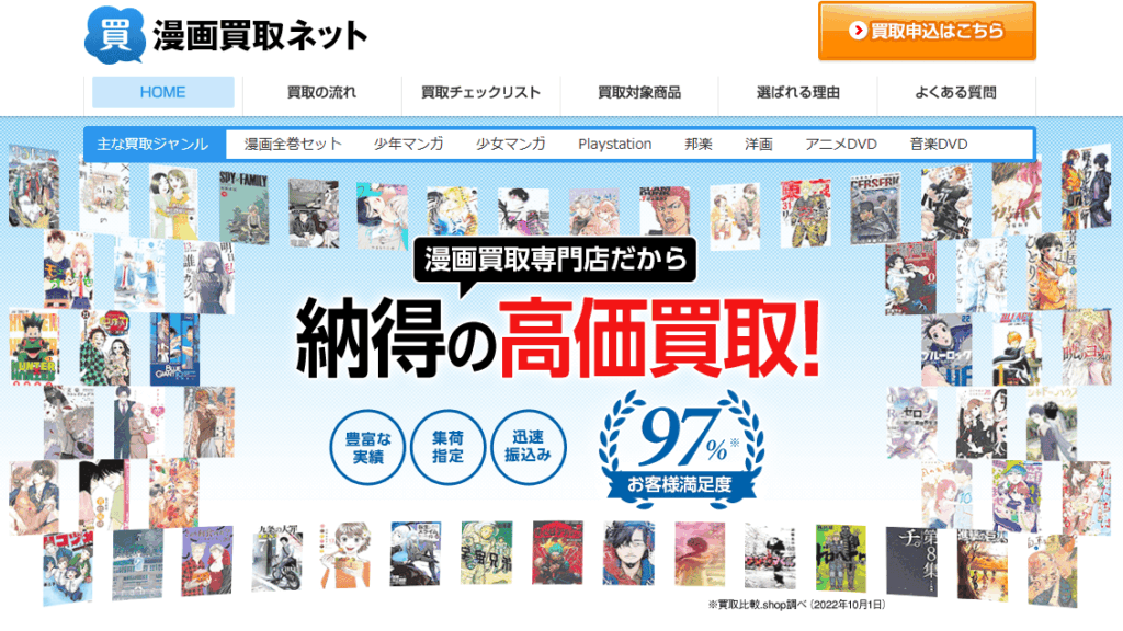 創業20年以上の漫画買取ネットです。宅配買取サービスを展開し、本、CD、DVD、ゲームの高価買取にこだわり、顧客満足度97%を達成しています。全国どこからでも無料で送れる宅配キットもご用意。ぜひ当社のサービスをご利用ください。